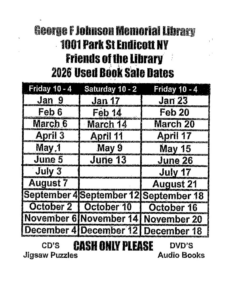 Our purpose is to help support the library and its services. To that end, we hold used book sales on the first and third Fridays of every month from 10 AM to 4 PM and on the second Saturday from 10:00 AM to 2:00 PM. (There are no Saturday sales in July and August). We accept donations from the public during the sales. After necessary expenses, all monies generated by our efforts, including membership dues, are used for the benefit of the library.