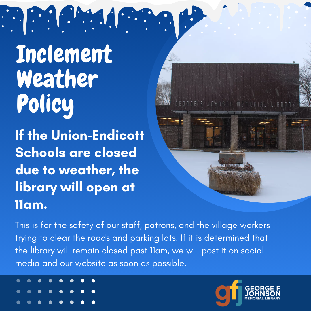Search our catalog Hours & Info My Account Digital Library Newsletter What’s happening? 📚 Get free weekly emails of our latest books, movies, and music on Wowbrary! ❄️ Please take a look at our inclement weather policy. 📖 Visit our Friends of the Library page for information on book sales and donations! Check out these recent posts from our Facebook page! George F. Johnson Memorial Library20 hours agoVisit gfjlibrary.org for more info. We hope to see you this week!54View on FacebookGeorge F. Johnson Memorial Library3 days agoTomorrow is your last chance to read to the therapy dogs this year! Stop by the children's room in the morning!53View on FacebookGeorge F. Johnson Memorial Library4 days agoThis weekend is our Kaleidoscope Health & Rescue Animal Adoption Event!719View on Facebook