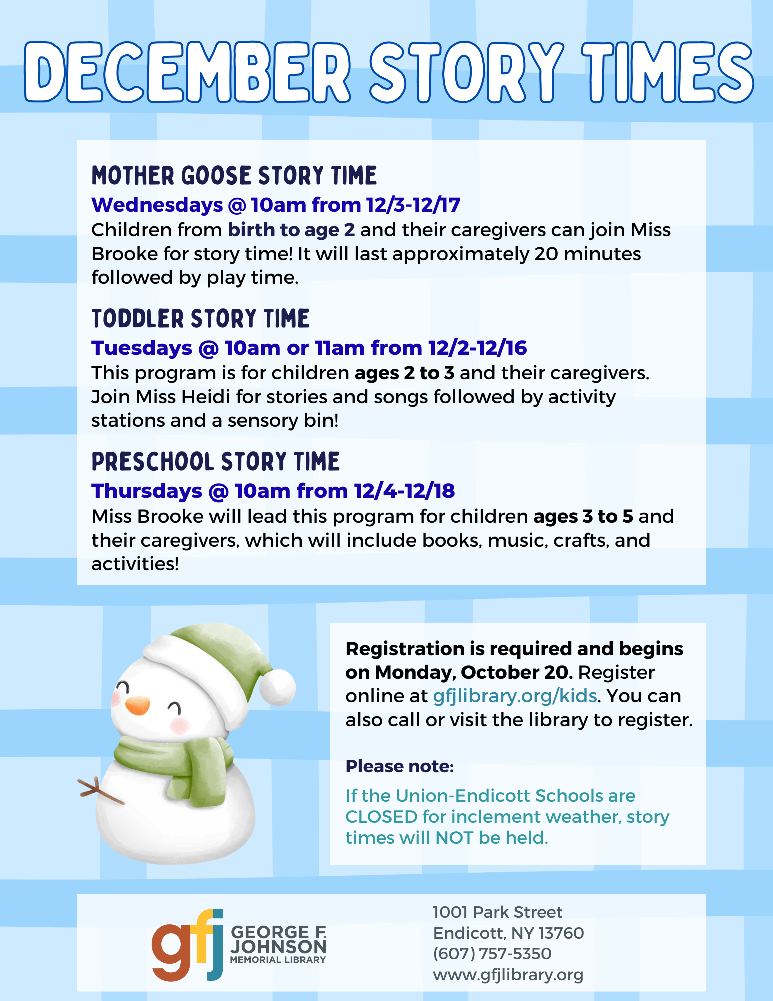 - Toddler Story Time – Tuesdays @ 10am or 11am from 12/2-12/16 for children ages 2 to 3 and their caregivers. Register for 10am @ gfjlibrary.libcal.com/event/15074814 & register for 11am @ gfjlibrary.libcal.com/event/15586334.