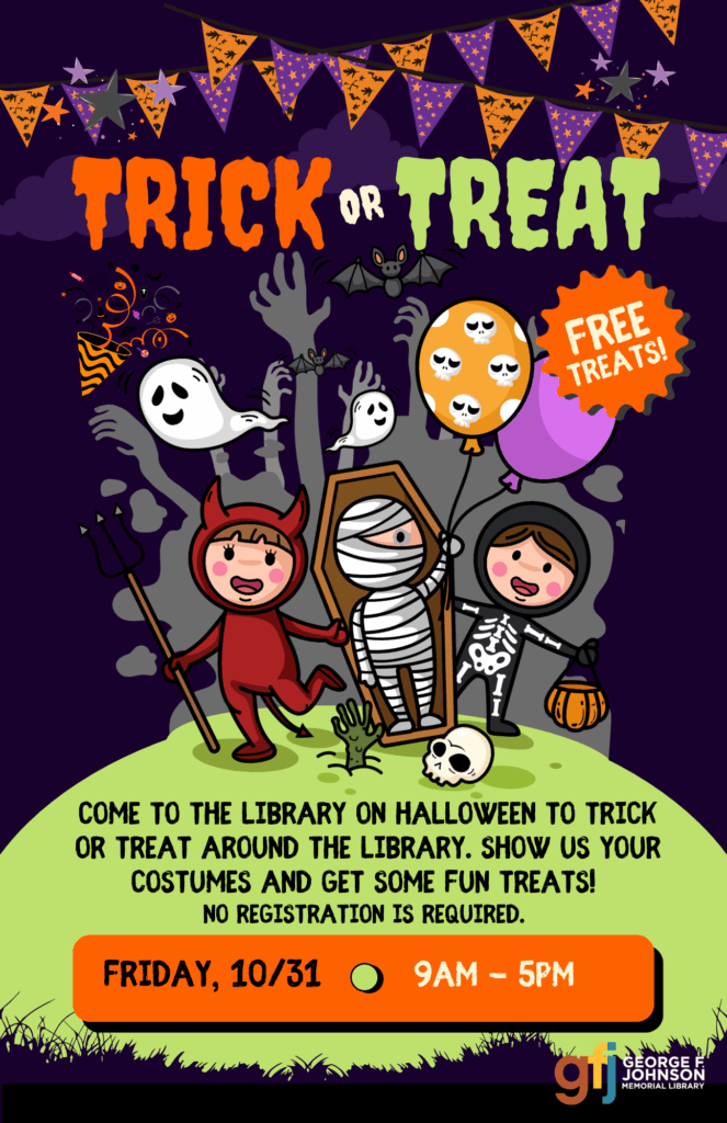 Come to the library on Halloween to trick or treat around the library. Show us your costumes and get some fun treats!