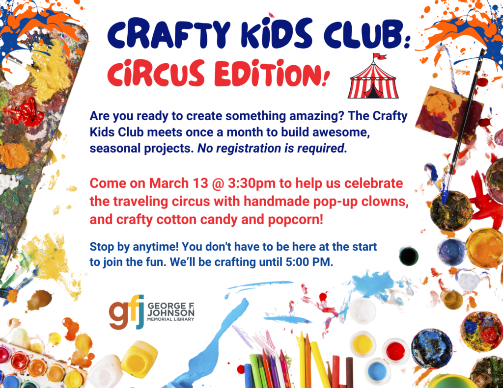 Crafty Kids Club: Circus Edition! : Are you ready to create something amazing? The Crafty Kids Club meets once a month to build awesome, seasonal projects. Come on March 13 @ 3:30 pm to help us celebrate the traveling circus with handmade pop-up clowns, and crafty cotton candy and popcorn! Stop by anytime! You don’t have to be here at the start to join the fun. We’ll be crafting until 5:00 PM. No registration is required.