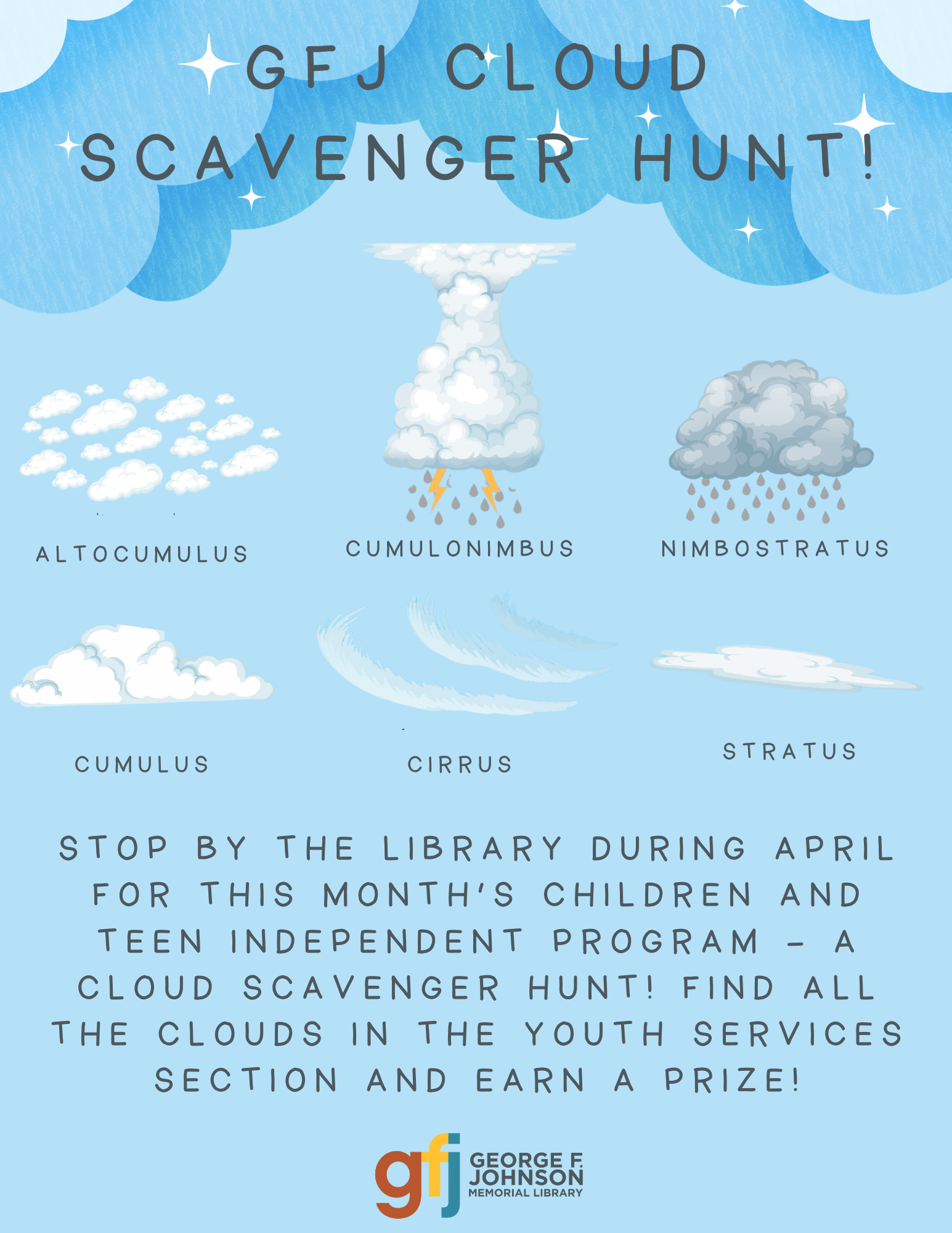 Stop by the library during April for this month’s children and teen independent program – a cloud scavenger hunt! Find all the clouds in the Youth Services section and earn a prize!