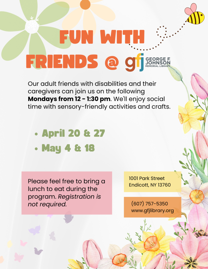 Our adult friends with disabilities and their caregivers can join us on the following Mondays from 12 – 1:30 pm. We’ll enjoy social time with sensory-friendly activities and crafts.