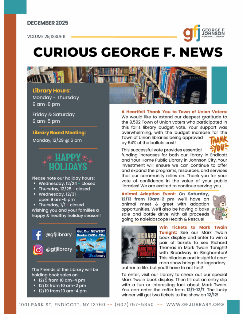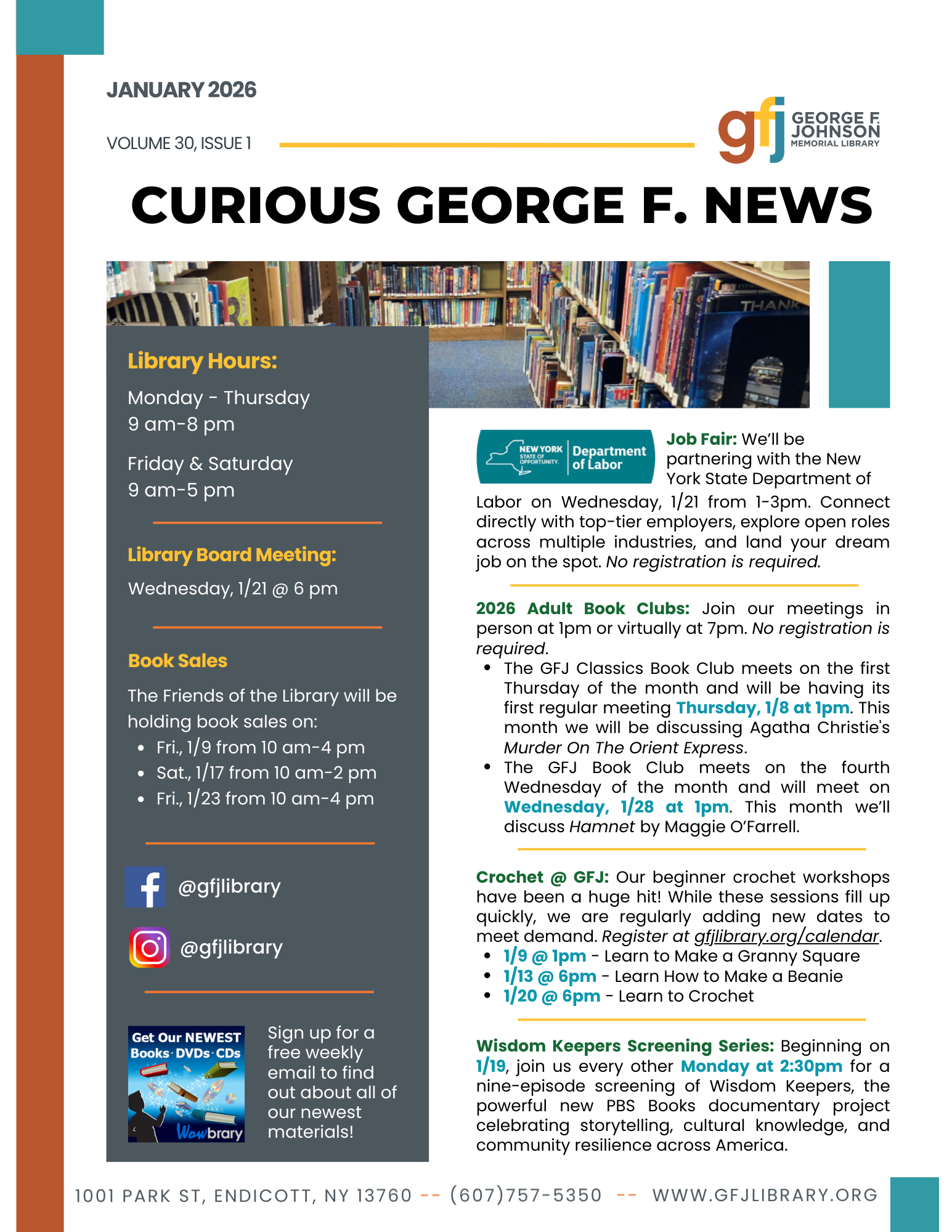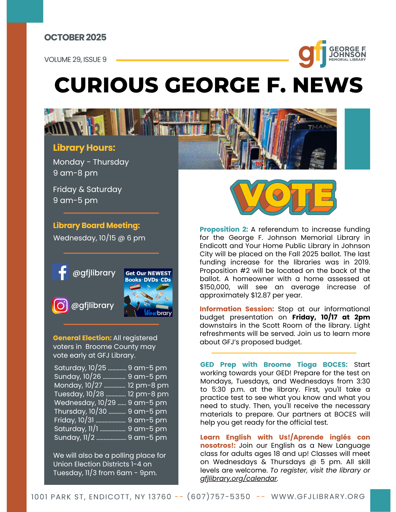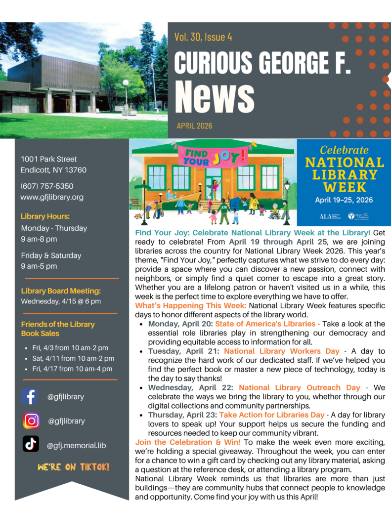 Welcome to the Curious George F. Newsletter! Subscribe to receive the newsletter monthly by emailing gfjnewsletter-join@4cls.org. View our newsletter as a pdf.